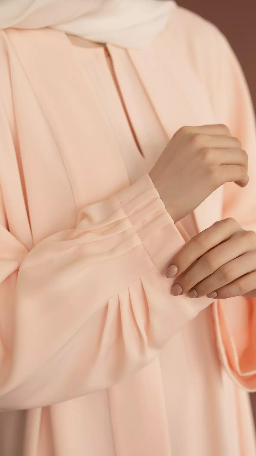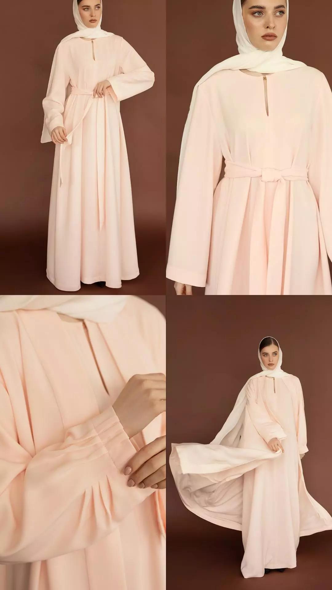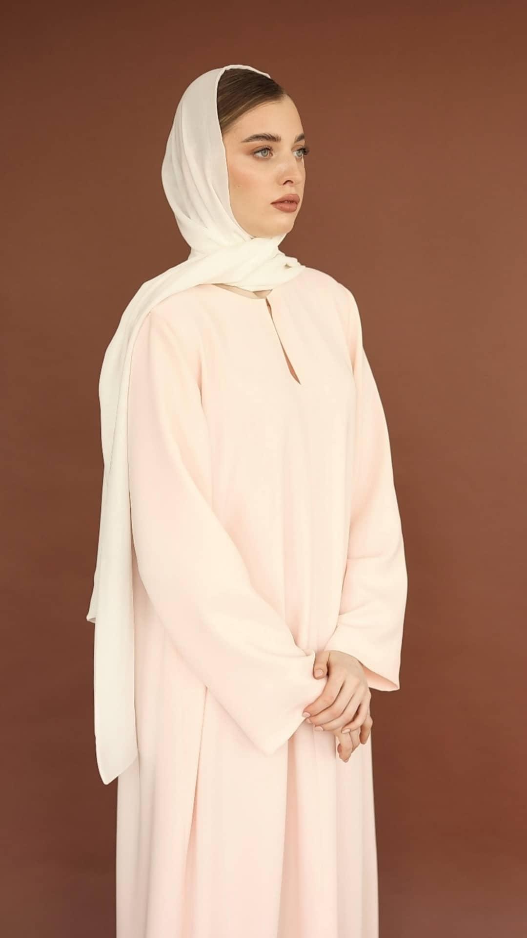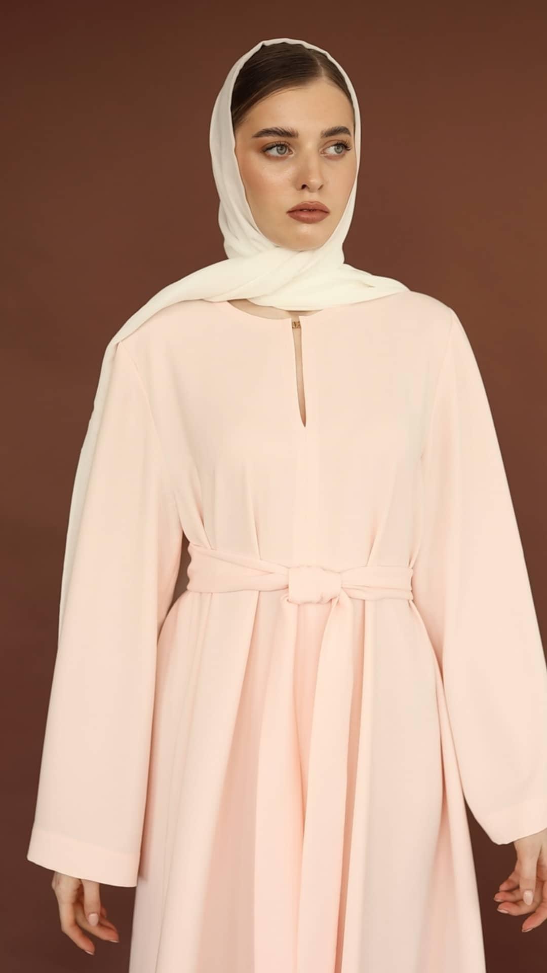 Dette eksklusive sæt bestående af abaya og kimono er specialdesignet og produceret med fokus på elegance, kvalitet og tidløs femininitet. Designet kombinerer et rent, minimalistisk snit med raffinerede detaljer, der giver et smukt og flydende fald.