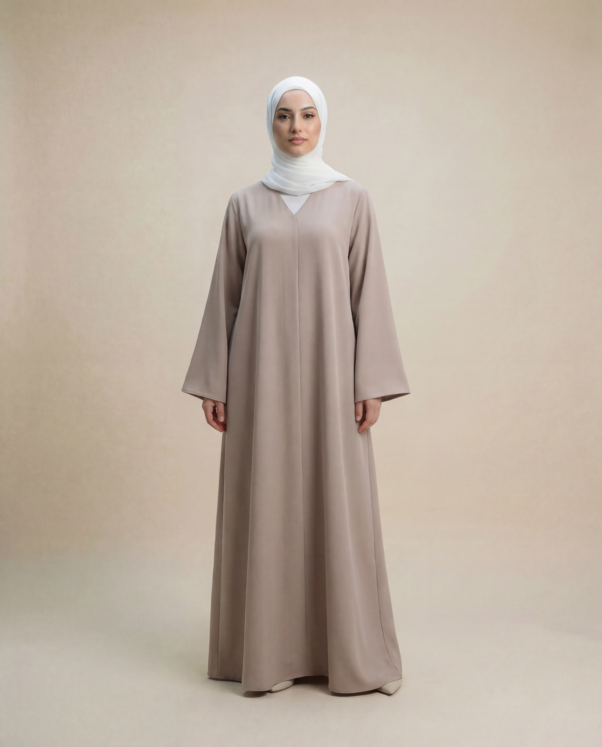 Denne smukke abaya forener tidløs elegance med uovertruffen komfort. Den er fremstillet af den fineste korean nidha, kendt for sin lette, åndbare og bløde kvalitet, der falder smukt og føles luksuriøs mod huden. Det minimalistiske design med V-udskæring foran giver et moderne twist til den klassiske silhuet, mens de brede, lige ærmer sikrer en afslappet pasform og elegant bevægelse. Den neutrale sandstone beige farve gør abayaen alsidig og perfekt til både hverdagsbrug og særlige anledninger.